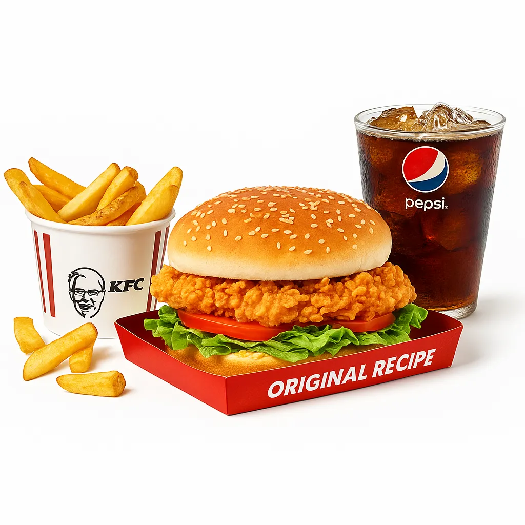 The KFC Zinger Burger Meal includes a spicy Zinger burger, fries, and a drink perfect for a tasty treat.